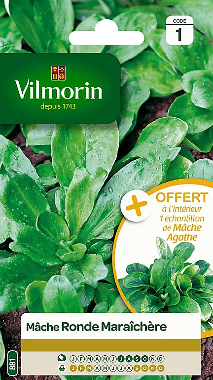 | Instructions de semis | Semer en place de fin juillet à octobre à la volée ou, de préférence, en lignes distantes de 20 cm. Protéger éventuellement les derniers semis par un tunnel pour prolonger la récolte au printemps. Récolter de septembre à mars. La nature du sol a peu d'importance pourvu qu'il soit ferme et sans mauvaises herbes. La mâche est peu exigeante, maintenez simplement un sol frais par des arrosages réguliers pour les semis d'été |