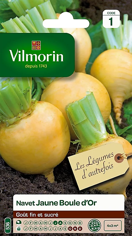 | Instructions pour plantation | Semer en pleine terre en juillet-août, en lignes distantes de 30 cm. Eclaircir les plants à 10-15 cm. Récolter d'octobre à mi-décembre. Incorporer, lors de la préparation du sol, un produit contre les mouches des semis, du chou et autres insectes du sol. Pendant les chaleurs, croissance lente et manque d'eau rendent les navets fibreux. Penser à les arroser souvent pour qu'ils poussent vite et restent à la fois tendres et savoureux.Conservation : aux premiers gels, arracher les racines, couper les feuilles au ras du collet, et disposer les racines bien sèches, en cave dans du sable |
